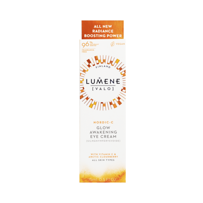 LUMENE Nordic-C [Valo] Heleyttävä silmänympärysvoide kliinisesti testatusti* virkistää ja vähentää väsymyksen merkkejä, tummuutta, turvotusta ja ryppyjä, auttaen tekemään ilmeestä kirkkaamman ja virkistyneen näköisen. Hajusteeton koostumus sisältää ainutlaatuisen kirkastavan yhdistelmän antioksidanttipitoista pohjoista lakkaa ja C-vitamiinia. Yhdistettynä hyalyronihappoon ja polyglutamiiniin, tehokas koostumus antaa iholle ennennäkemätöntä hehkua. Vegaaninen koostumus sisältää sivuvirroista kehitettyjä ja pohjoisen luonnosta peräisin olevia raaka-aineita. Pakkauksessa on käytetty kierrätettyjä ja kierrätettäviä materiaaleja. Nordic-C [Valo] Heleyttävä silmänympärysvoide häivyttää kliinisesti testatusti tummia silmänalusia 2 viikossa* +59% kirkkaampi iho** +66% sileämpi iho** Itsearviointitutkimuksessa: 100% Vastaajista: iho on kirkkaampi*** 100% Vastaajista: silmänympärysiho näyttää virkistyneeltä*** 100% Vastaajista: iho on kosteutettu*** 100% Vastaajista: iho on kiinteämpi*** *Klii