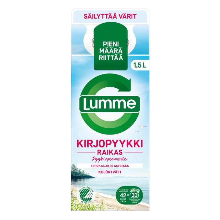 Lumme Kirjopyykillä puhdas ja raikas lopputulos jo 30 asteessa. Kirjopyykin pesuun erityisesti suunniteltu pesuneste on hellävarainen pyykin väreille. Pehmeä mieto tuoksu. Tuote on ympäristömerkitty Joutsenmerkillä ja Vegan Society -sertifioitu, eikä se sisällä eläinperäisiä ainesosia.