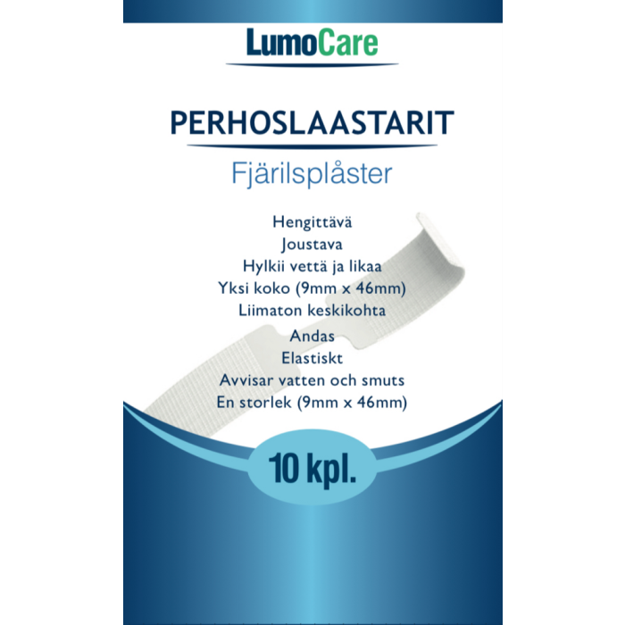 Veden pitävä perhoslaastari liimattomalla keskikohdalla (ei tartu kiinni suoraan haavaan). Isomman liimapinnan ansiosta voidaan asettaa paikalleen ilman apuvälineitä (esim. pinsetit). CE merkitty lääkinnällinen laite Valmistaja NINGBO TIANBO FIRST AID PRODUCT CO.,LTD
