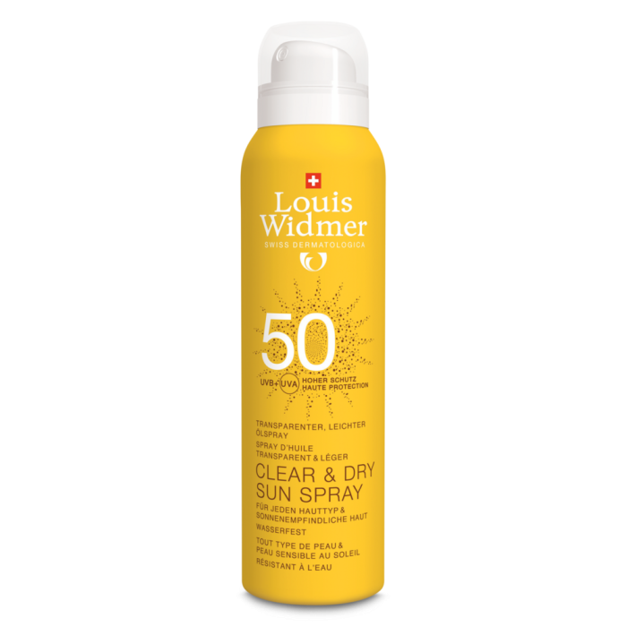 Louis Widmerin Clear & Dry Sun Spray 50 aurinkosuojasuihke korkealla UVA-ja UVB -suojalla on erityisen kevyt ja tahraamaton, imeytyy muutamassa sekunnissa eikä se jätä tahmeaa tunnetta iholle. Dry Touch -teknologian ansiosta iholle miellyttävä, silkkinen tunne. Tuotteen annostelu on helppoa ja nopeaa; 360 asteen spraypullo, joka toimii missä tahansa asennossa, jopa ylösalaisin. E-vitamiini suojaa vapaita radikaaleja vastaan ja vähentää UV-säteilyn iholle aiheuttamia vaurioita. Kaikille ihotyypeille, myös herkälle iholle aikuisille ja lapsille. Vedenkestävä. Tuote on hajusteeton.