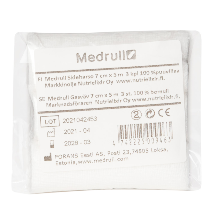 Medrull sideharsopakkaus sisältää 3 sideharsorullaa kooltaan 7 cm x 5 m.