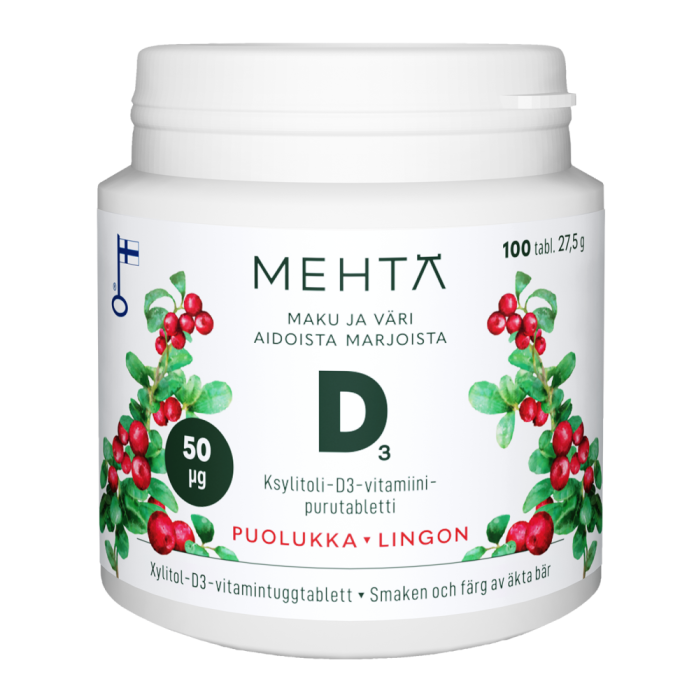 Mehtä 50 µg sopii päivittäiseksi D-vitamiinilisäksi täydentämään riittävää D-vitamiinin saantia. Valmiste sisältää ihmiselle luontaista, hyvin imeytyvää D3-vitamiinimuotoa. Puolukan makuisen tabletin voi pureskella, imeskellä tai niellä. Tabletti on makeutettu hammasystävällisellä ksylitolilla.
