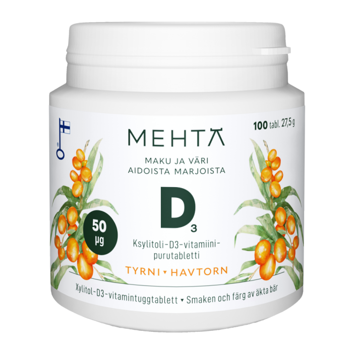 Mehtä 50 µg sopii päivittäiseksi D-vitamiinilisäksi täydentämään riittävää D-vitamiinin saantia. Valmiste sisältää ihmiselle luontaista, hyvin imeytyvää D3-vitamiinimuotoa. Puolukan makuisen tabletin voi pureskella, imeskellä tai niellä. Tabletti on makeutettu hammasystävällisellä ksylitolilla.