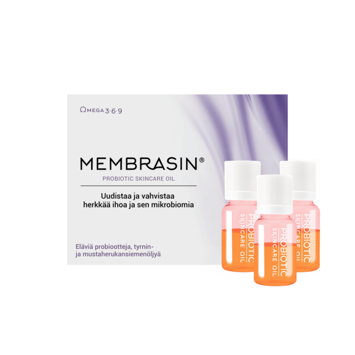 Membrasin® Probiotic Skincare Oil -öljy on ainutlaatuinen ja innovatiivinen ihoöljy, joka sisältää aktiivisia, eläviä probiootteja. Se elvyttää, kosteuttaa ja pehmentää erittäin kuivaa ihoa. Öljy sisältää eläviä Lactobacillus rhamnosus -bakteerikantoja sekä kotimaisia tyrnin- ja mustaherukansiemenöljyjä.