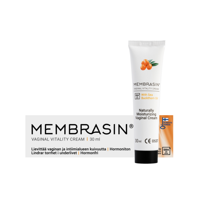 Kotimainen kolmitehoinen voide intiimialueiden ja emättimen kuivuusoireisiin. Membrasin Vaginal Vitality Cream -voiteen sisältämä tyrniöljy suojaa ja kosteuttaa limakalvoja, hyaluronaatti lisää kosteutta ja maitohappo ylläpitää normaalia pH-tasapainoa. Valmiste on hormoniton ja hajusteeton ja sillä on kliinisesti osoitettu teho. Pakkaus sisältää uudelleen käytettävän asettimen. Membrasin Vaginal Vitality Cream on kehitetty ja valmistettu Suomessa.