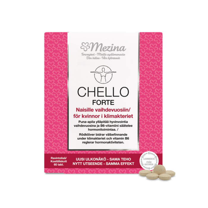 Chello Forten puna-apila hillitsee hikoilua ja kuumia aaltoja sekä vähentää levottomuutta ja ärtyneisyyttä. Salvia ylläpitää hormonitasapainoa sekä vahvistaa hiuksia, silloin kun hiustenlähtöön liittyy hormonaalista epätasapainoa. Chelloon on lisätty B6-vitamiinia säätelemään hormonitoimintaa sekä vähentämään väsymystä ja uupumusta.