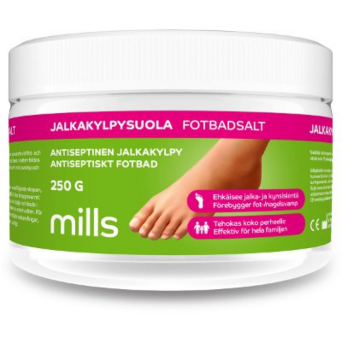 Mills Jalkakylpysuola on antiseptinen jalkakylpy, joka ennaltaehkäisee tehokkaasti jalkojen sieni-infektioiden leviämistä ja uusiutumista puhdistamalla samalla ihoa. Toisin kuin tavanomaiset kylpysuolat, Mills Jalkakylpysuola on CE merkitty lääkinnällinen laite, jolla on tutkittua tehoa. Mills Jalkakylpysuola on hajusteeton ja turvallinen kaikenikäisille.