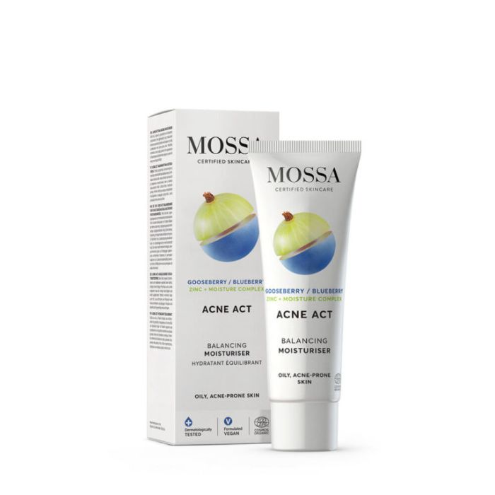 Mossa Acne Act kosteusvoide on kevyt, mehukas voide ja se sisältää sinkkiä, arganiaöljyä ja luonnollisia kosteuttajia, jotka tasapainottavat sekä ehkäisevät tulehduksia samalla kosteuttaen ja rauhoittaen ihoa.