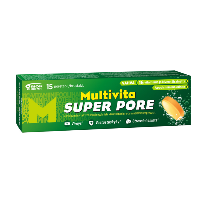 Multivita Super Pore on vahva, hyvänmakuinen porejuomatabletti, jonka sisältämät vitamiinit ja kivennäisaineet auttavat jaksamaan¹, buustaavat vastustuskykyä² ja henkistä suorituskykyä³ sekä pitävät stressitasot hallinnassa⁴! Raikkaan appelsiininmakuinen, poreileva juoma sisältää 16 vitamiinia ja kivennäisainetta, mm. vahvan annoksen kaikkia päivittäin tarvittavia B-ryhmän vitamiineja, C -ja D-vitamiinia sekä runsaasti muita vitamiineja ja kivennäisaineita. Nauti täysillä jokaisesta päivästäsi! ¹B2-, B3-, B6- ja B12-vitamiinit auttavat vähentämään väsymystä ja uupumusta. ²C- ja D-vitamiini edistävät immuunijärjestelmän normaalia toimintaa. ³Pantoteenihappo (B5) edistää normaalia henkistä suorituskykyä. ⁴Sinkki ja jodi edistävät normaalia kognitiivista toimintaa.