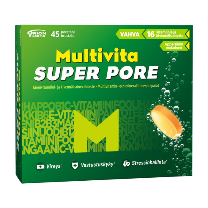 Multivita Super Pore on vahva, hyvänmakuinen porejuomatabletti, jonka sisältämät vitamiinit ja kivennäisaineet auttavat jaksamaan¹, buustaavat vastustuskykyä² ja henkistä suorituskykyä³ sekä pitävät stressitasot hallinnassa⁴! Raikkaan appelsiininmakuinen, poreileva juoma sisältää 16 vitamiinia ja kivennäisainetta, mm. vahvan annoksen kaikkia päivittäin tarvittavia B-ryhmän vitamiineja, C -ja D-vitamiinia sekä runsaasti muita vitamiineja ja kivennäisaineita. Nauti täysillä jokaisesta päivästäsi! ¹B2-, B3-, B6- ja B12-vitamiinit auttavat vähentämään väsymystä ja uupumusta. ²C- ja D-vitamiini edistävät immuunijärjestelmän normaalia toimintaa. ³Pantoteenihappo (B5) edistää normaalia henkistä suorituskykyä. ⁴Sinkki ja jodi edistävät normaalia kognitiivista toimintaa.