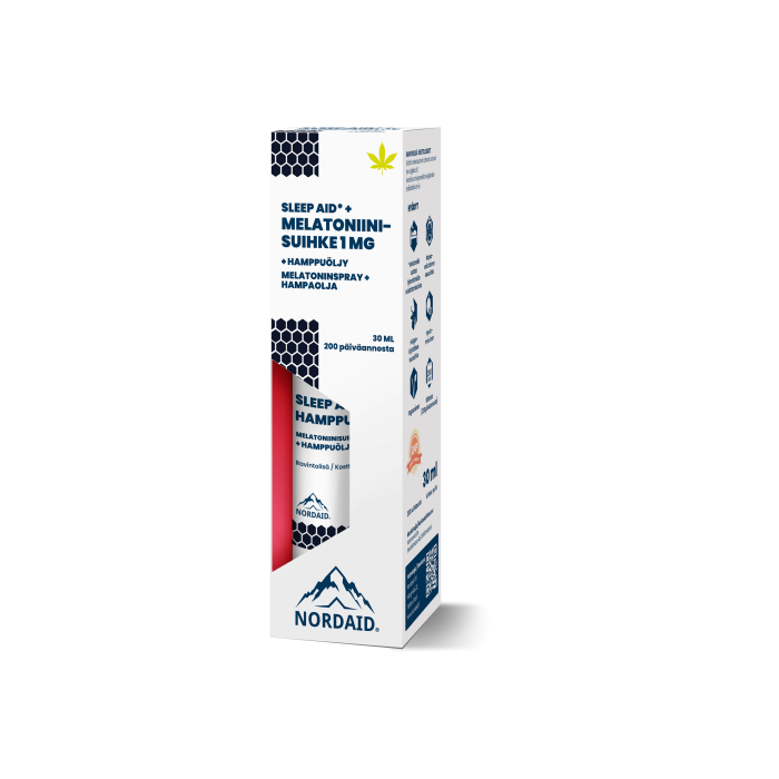 Nordaid Sleep Aid Melatoniini 1 mg + Hamppuöljy tarjoaa tehokkaan ja luonnollisen tavan tukea nopeaa nukahtamista ja lievittää aikaerorasitusta. Tämä kätevä suihke imeytyy suoraan suun limakalvoilta, mikä takaa nopean vaikutuksen juuri silloin, kun sitä tarvitset. Suihkeen sisältämä melatoniini auttaa lyhentämään nukahtamisaikaa, kun sitä nautitaan 1 mg lähellä nukkumaanmenoaikaa, ja suositeltava vuorokausiannos sisältää melatoniinia 1,95 mg.