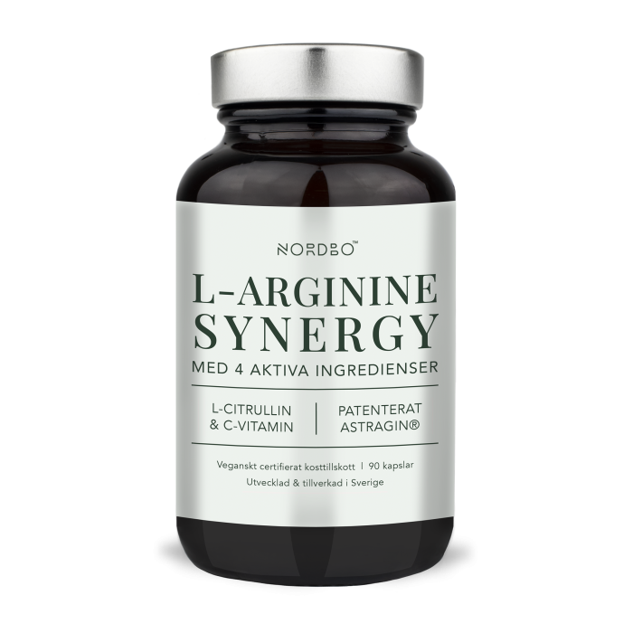 Nordbo L-Arginine Synergy on synerginen kompleksi, jossa yhdistyvöt L-arginiini- ja L-sitrulliini -aminohapot sekä C-vitamiini (kalsiumaskorbaatti) ja AstraGin®-uute.