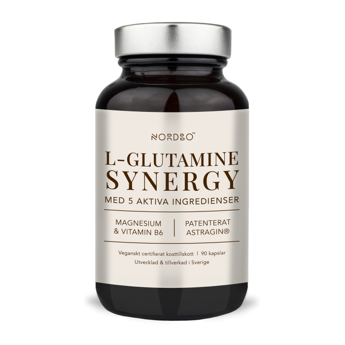 Nordbo L-Glutamine Synergy on synerginen kompleksi, joka sisältää L-glutamiinia, magnesiumbisglysinaattia, Le Guerandais -merisuolaa, B6-vitamiinia ja AstraGin®-uutetta.