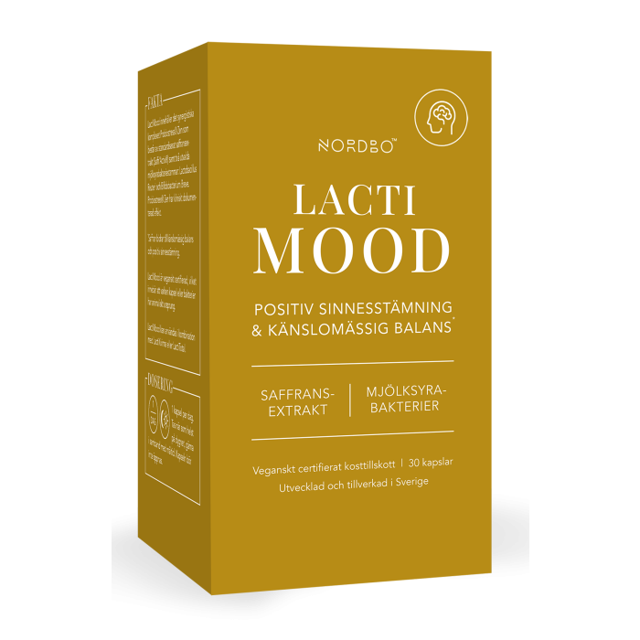Nordbo LactiMood on suunniteltu tukemaan henkistä hyvinvointia kokonaisvaltaisesti. Se sisältää synergistisen Probiostress®-kompleksin, jossa on standardoitua sahramiuutetta sekä 4 miljardia elävää maitohappobakteeria (Lactobacillus Reuteri ja Bifidobacterium Breve).