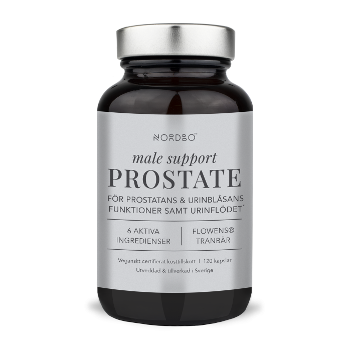 Nordbo Male Support Prostate on kehitetty miesten eturauhasen, virtsateiden ja virtsarakon hyvinvoinnin tueksi. Tuote sisältää 6 aktiivista ainesosaa: Flowens®-karpalouutteen, kurpitsansiemeniä, granaattiomenaa, nokkosta, sinkkiä ja seleeniä.