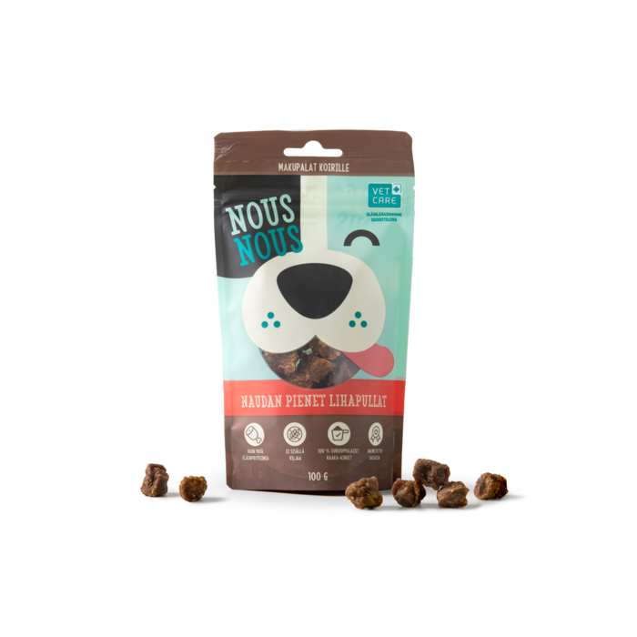 NousNous naudan pienet lihapullat sopivat käytettäväksi koulutukseen ja herkutteluun koirille. Toimii terveellisenä väli- tai koulutusmakupalana. Säilytetään kuivassa ja viileässä.