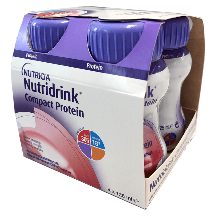 Nutridrink Compact Protein on käyttövalmis kliininen ravintovalmiste, joka on tarkoitettu sairauteen liittyvän vajaaravitsemuksen ruokavaliohoitoon. Sisältää kaikkia päivittäin tarvittavia vitamiineja ja kivennäisaineita.