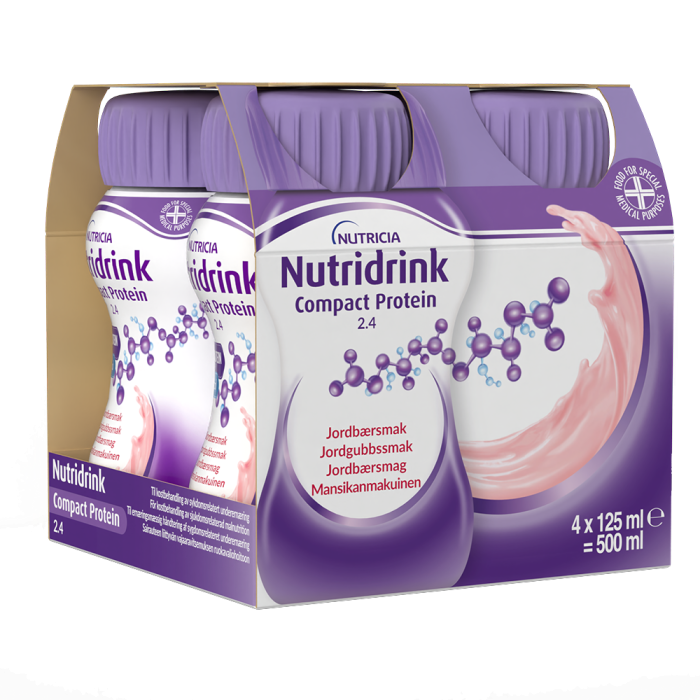 Kaikki päivän tarpeelliset vitamiinit ja kivennäisaineet sekä sopiva annos proteiinia yhdessä annosjuomassa – Nutridrink Compact Protein on monipuolinen täydennysravintojuoma, joka sopii vajaaravitsemustilasta kärsiville. Pirtelömäinen koostumus ja herkulliset makuvaihtoehdot tekevät valmisteen käytöstä miellyttävää.