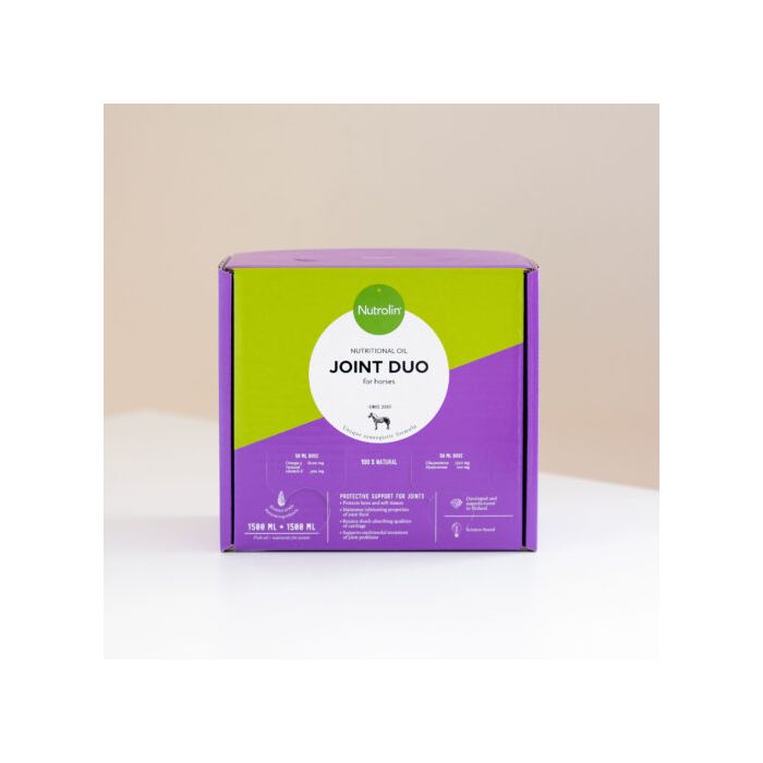Nutrolin® HORSE Joint Duo koostuu kahdesta komponentista – nestemäisestä kalaöljystä ja nestemäisestä nivelvalmisteseoksesta. Joint Duon valmistuksessa käytetty kalaöljy ja nivelravinteet ovat lääke- ja elintarvikelaatuisia raaka-aineita. Raaka-aineiden lääkelaatu tarkoittaa sitä, että niiden valmistus tapahtuu lääkeviraston valvonnassa, niiden koostumus on tarkasti kuvattu ja vaikutus on sama valmistuserästä toiseen.