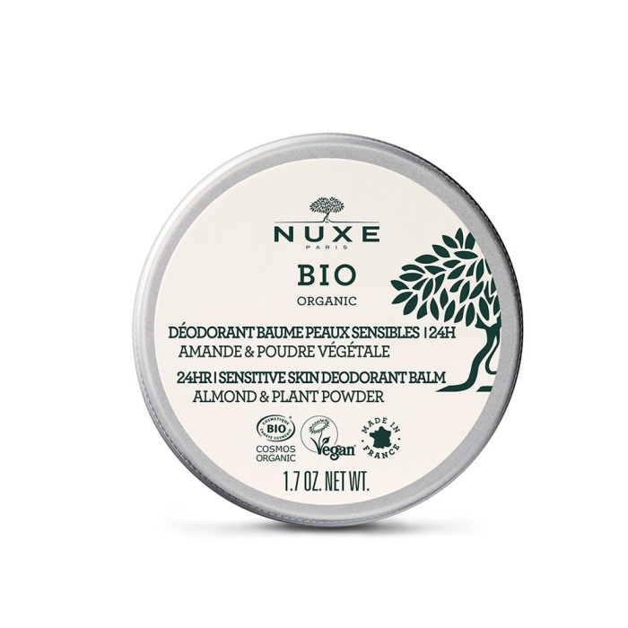Nuxe Bio Organic 24hr Sensitive Skin Deodorant Balm on vedetön hellävarainen voidedeodorantti, joka on tehokas epämiellyttävää hajua vastaan, ja jossa on miellyttävä hoitava puuterimainen balmikoostumus. Sopii kaikille ihotyypeille, myös herkkäihoisille. Koostumus sisältää pehmittävää mantelivoita ja kasvipuutereita.
