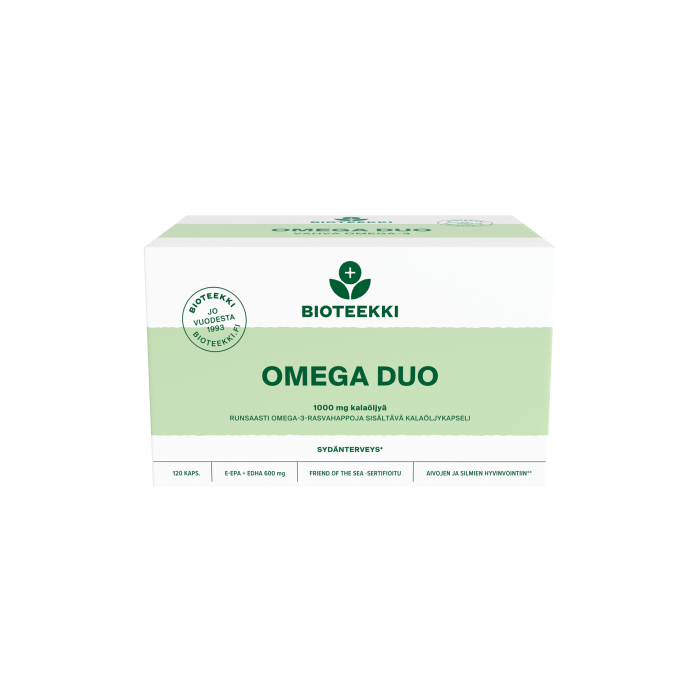 Bioteekin Omega DUO on vahva omega-3-valmiste jonka avulla varmistat riittävän EPAn ja DHAn saannin puhtaasti ja turvallisesti. Tuote sisältää tasapainoisesti EPA:a ja DHA:ta, yhteensä 650 mg/kaps. EPA ja DHA edistävät sydämen normaalia toimintaa. DHA edistää aivotoiminnan ja näön pysymistä normaalina. Omega DUO on ympäristösertifioitu Friend of the Sea -valmiste eli se on valmistettu kestävän kehityksen periaattein tuotetusta kalaöljystä.