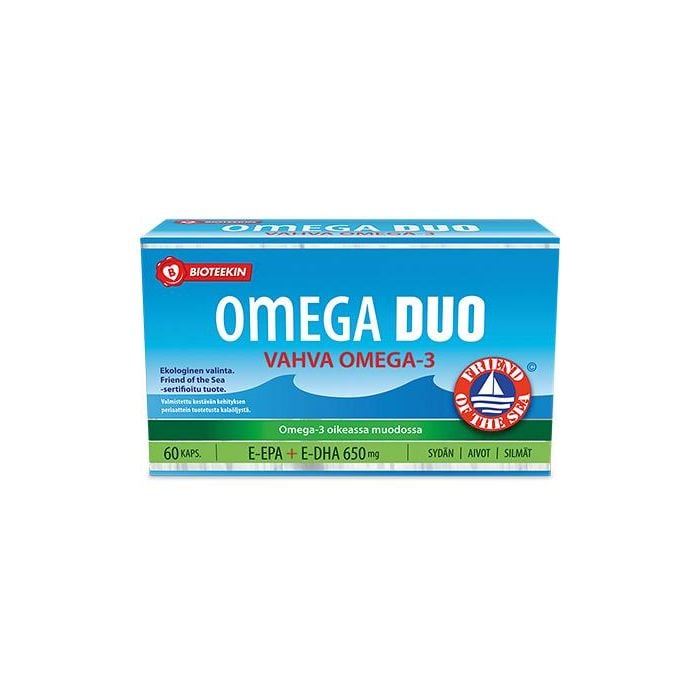 Bioteekin Omega DUO on vahva omega-3-valmiste jonka avulla varmistat riittävän EPAn ja DHAn saannin puhtaasti ja turvallisesti. Tuote sisältää tasapainoisesti EPA:a ja DHA:ta, yhteensä 650 mg/kaps. EPA ja DHA edistävät sydämen normaalia toimintaa. DHA edistää aivotoiminnan ja näön pysymistä normaalina. Omega DUO on ympäristösertifioitu Friend of the Sea -valmiste eli se on valmistettu kestävän kehityksen periaattein tuotetusta kalaöljystä.