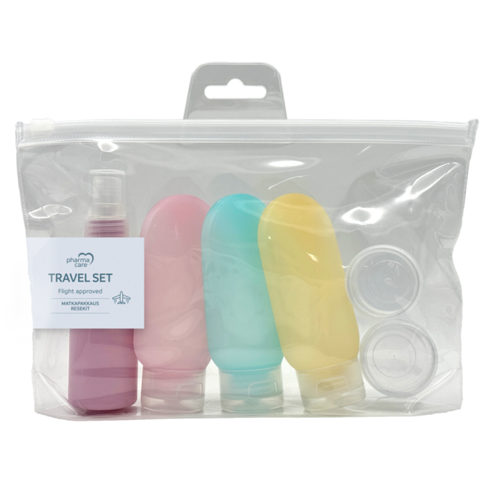 Matkasetti, jossa eri kokoisia tyhjiä pulloja.