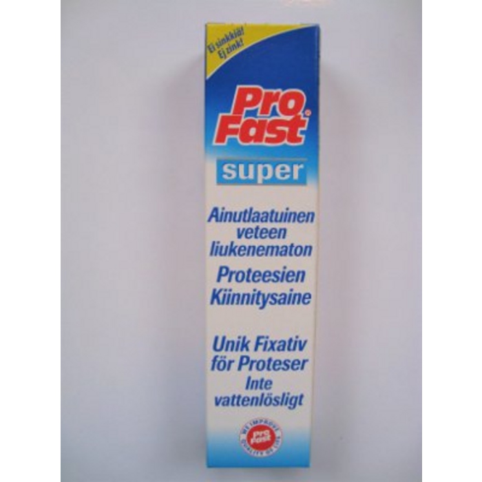 ProFast proteesien kiinnitysaine antaa erittäin hyvän pidon proteesille, koska se ei ole vesiliukoinen. Nesteen juominen tai sylki ei heikennä pitoa. Sopii sekä ylä-, ala- että osaproteeseille. Ilman makuaineita.