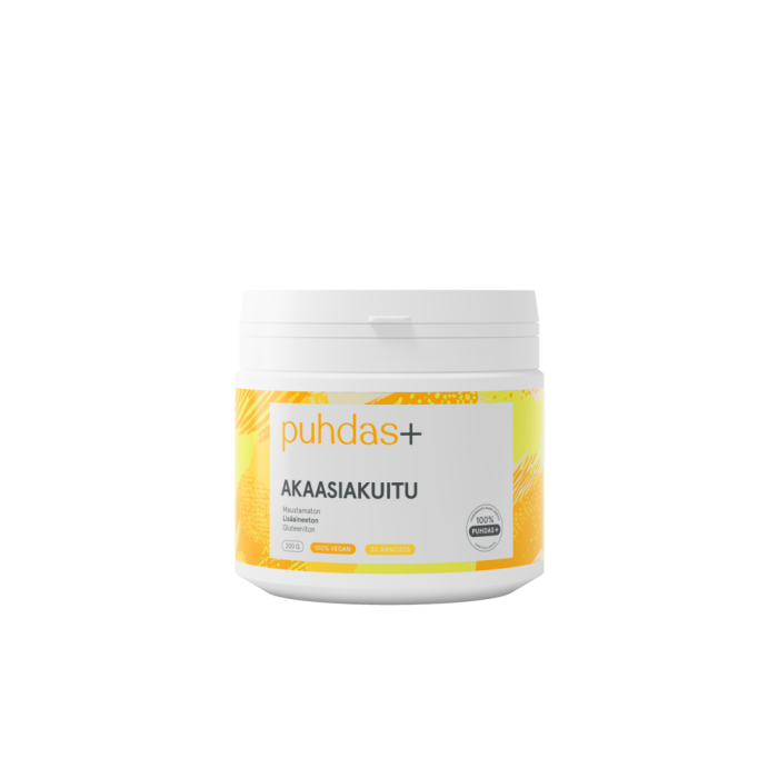 Akaasiakuitu on täysin gluteeniton kuitu vatsan ja suoliston hyvinvointiin. Tuotetta voi käyttää lisäkuidun lähteenä esimerkiksi gluteenittomassa, viljattomassa tai VHH-ruokavaliossa. Akaasiakuitu on maultaan neutraali, ja se sekoittuu hyvin nesteeseen. Monesta muusta kuidusta poiketen akaasiakuitu ei turpoa nesteessä. Sen voi sekoittaa esimerkiksi smoothieen tai veteen. Puhdas+ tuotteet ovat korkealaatuisia ravintolisiä. Valmistuksessa ei käytetä ylimääräisiä ainesosia, kuten säilöntäaineita, väriaineita ja pintakäsittelyaineita.