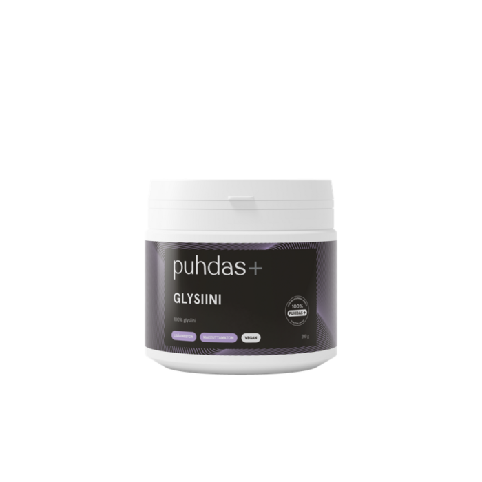 Puhdas+ Glysiini on ravintolisä ilman turhia lisäaineita. Glysiini on ei-välttämätön aminohappo, sillä keho pystyy tuottamaan sitä myös itse. Glysiini on muun muassa yksi kollageenin tärkeimmistä rakenneosista.