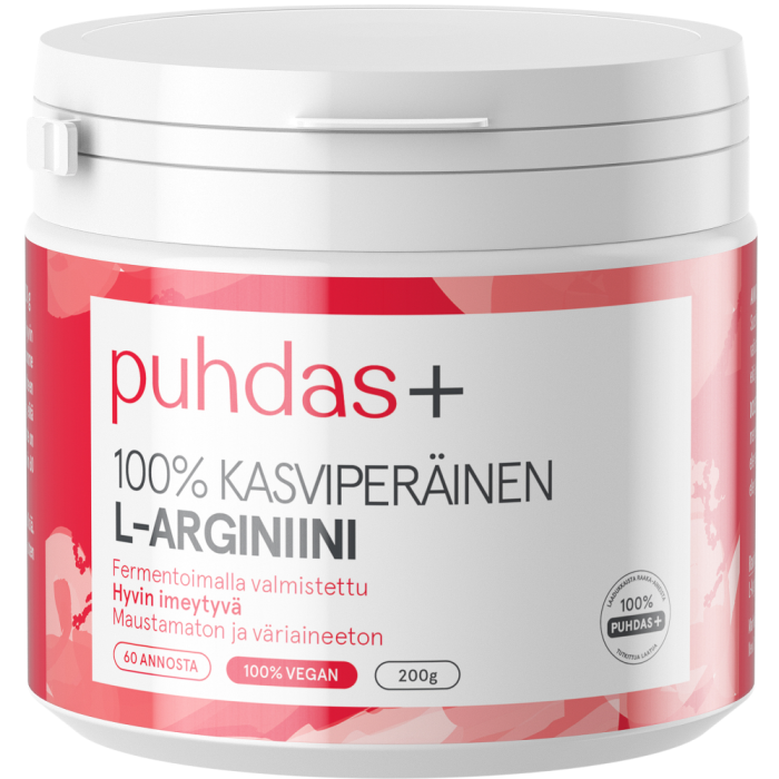 L-Arginiini on aminohappo, joka edistää elimistön typpihapon tuotantoa. Puhdas+ L-arginiini on 100 % kasviperäinen.