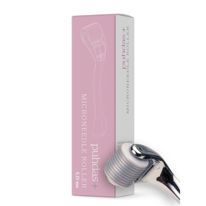 Puhdas+ 0,25 mm mikroneulain. Kotikäyttöön soveltuva mikroneulain on erinomainen väline stimuloimaan ihon kollageenituotantoa, kiinteyttämään ja tasoittamaan ihoa, arpia, aknea ja pieniä juonteita. Kotona tehtävä mikroneulaus vaatii aina erityistä huolellisuutta ja puhdasta ympäristöä, sillä mikroneulauksessa iholle rullataan tuhansia pieniä reikiä, joiden avulla tehoaineet imeytyvät paremmin. Neulojen materiaali: Japanilaista kirurginterästä