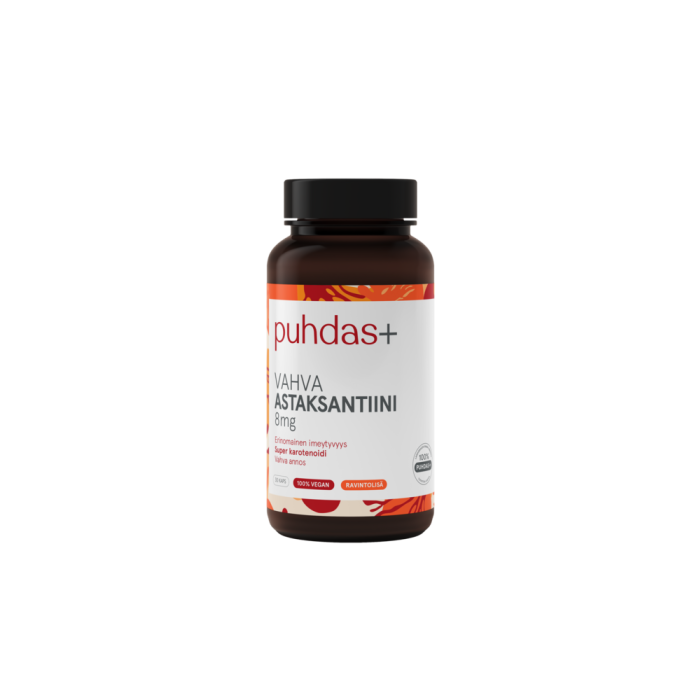 Puhdas+ Astaksantiini on vahva ja puhdas ravintolisä, joka sisältää luonnollista astaksantiinia Haematococcus pluvialis -mikrolevästä. Astaksantiini on voimakas punertava karotenoidi ja tunnettu antioksidantti. Yksi kapseli sisältää 8 mg korkealaatuista astaksantiinia – optimaalinen annos päivittäiseen käyttöön.