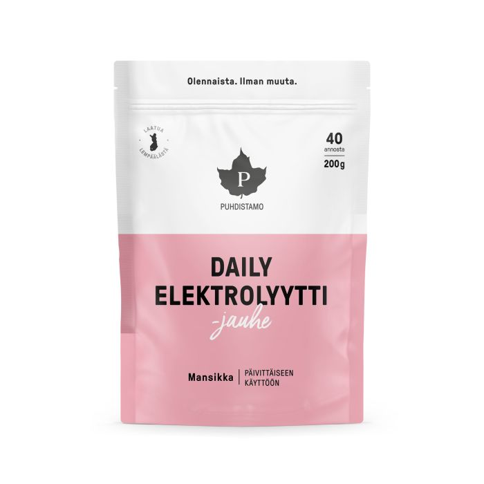 Puhdistamon Daily Elektrolyyttijauhe on raikas mansikan makuinen janonsammuttaja, joka auttaa ylläpitämään kehon optimaalista nestetasapainoa.
