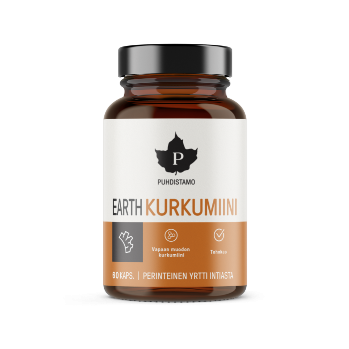 Puhdistamo Earth Kurkumiini nostaa vapaan kurkumiinin määrää verenkierrossa erittäin tehokkaasti ja pitkävaikutteisesti.