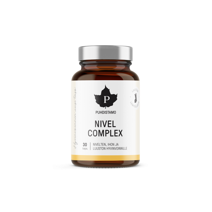 Puhdistamon Nivel Complex on täsmätuote nivelten, ihon ja luuston hyvinvoinnin tukemiseen. Sen sisältämä C-vitamiini tukee luonnollista kollageenin muodostumista verisuonten, ihon, ruston ja luuston normaalia toimintaa varten. C-vitamiini ja mangaani edistävät luuston pysymistä normaalina. Mangaani lisäksi vahvistaa sidekudosten normaalia muodostumista.