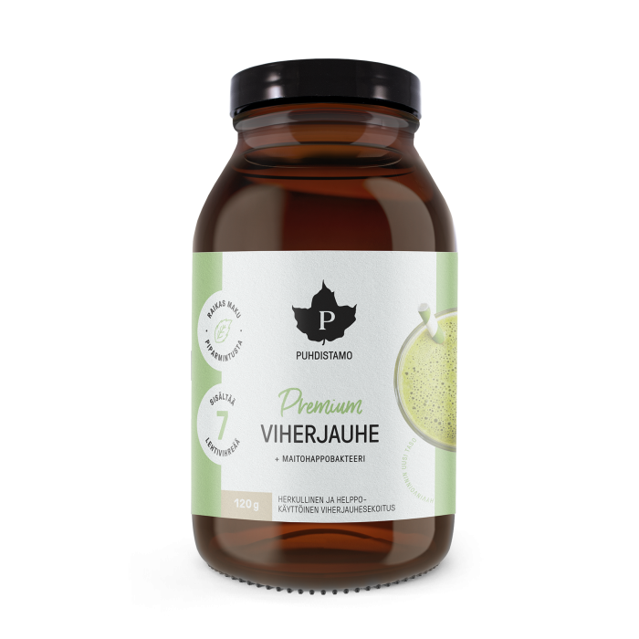 Premium Viherjauhe + Maitohappobakteeri on markkinoiden ravinnerikkain ja monipuolisin viherjauhesekoitus. Tämä hyvänmakuinen ja mintunraikas viherjauhesekoitus tarjoaa sekä viherjauheiden että maitohappobakteerien hyödyt samasta purkista, ilman makeutusaineita. Maitohappobakteerina on käytetty erittäin tehokasta itiömuotoista Lactospore®maitohappobakteeria (Bacillus coagulans MTCC 5856).