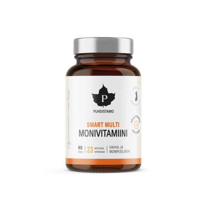 Puhdistamon Smart Multi -monivitamiini yhdistää 23 aktiivista ainesosaa harvinaisen vahvaksi ja tehokkaaksi kokonaisuudeksi. Suomessa valmistetut täyteaineettomat kapselit sisältävät muun muassa kaikki kahdeksan B-vitamiinia, joista metylaation kannalta merkittävimmät B2, B6, B9 ja B12 ovat aktiivisissa muodoissaan. Tuotteessa on myös runsaasti C-, D- ja E-vitamiineja sekä jodia ja sinkkiä, muiden olennaisten vitamiinien ja mineraalien ohella. Kokonaisuuden täydentävät harvinaisemmat ainesosat Q10, luteiini ja zeaksantiini. Suunniteltu päivittäiseen käyttöön