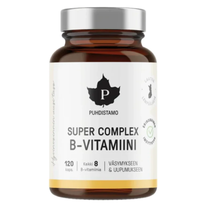 Super Complex B-vitamiini on vahva ja ainutlaatuinen yhdistelmä tehokkaasti imeytyviä, aktiivisia B-vitamiinin muotoja. Se sisältää kaikki kahdeksan B-vitamiinin muotoa samassa kapselissa! Näistä esimerkiksi B2-, B3-, B5-, B6- ja B9-vitamiini auttavat vähentämään väsymystä ja uupumusta. Tuote on kehitetty Suomessa ilman minkäänlaisia kompromisseja. Vegaaninen tuote.