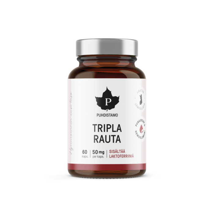 Puhdistamon Tripla Rauta on vahva ja monipuolinen rautavalmiste. Se sisältää kahta korkealaatuista raudan muotoa: rautabisglysinaattia ja ferrofumaraattia. Kolmantena komponenttina tuotteessa on mukana rautaa elimistössä kuljettavaa laktoferriiniä, joka sisältää myös itsessään hieman rautaa. Tuotteen C-vitamiini lisää entisestään raudan imeytymistä. Rauta auttaa muun muassa vähentämään väsymystä ja uupumusta, sekä edistää normaalia punaisten verisolujen ja hemoglobiinin muodostumista.
