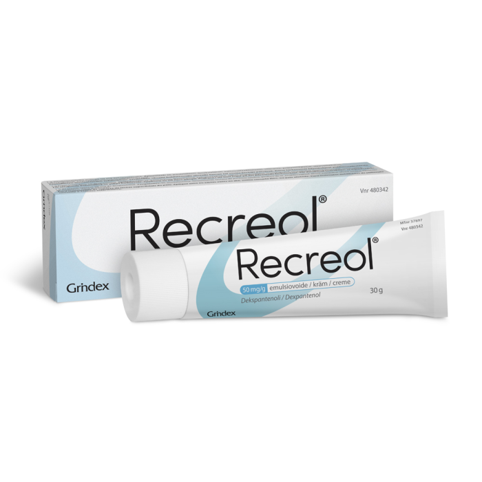 Recreol-emulsiovoiteen vaikuttava aine on dekspantenoli, joka kuuluu haavojen ja haavaumien hoitoon käytettävien lääkeaineiden ryhmään. Dekspantenoli muuntuu kudoksissa pantoteenihapoksi, joka palauttaa ihon kimmoisuuden ja edistää haavojen parantumista. Recreol-voidetta voidaan käyttää lapsille, nuorille ja aikuisille.
