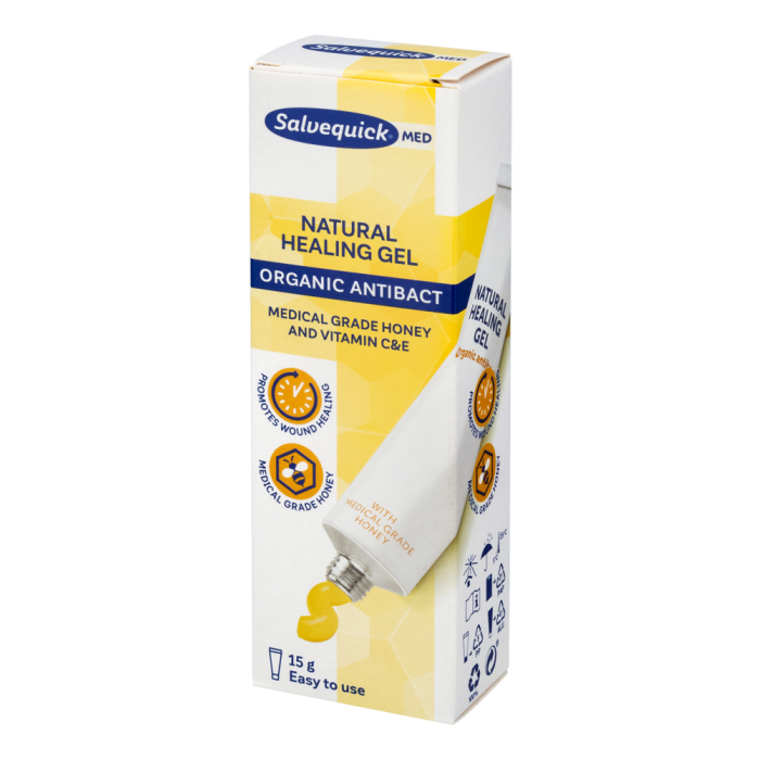 Salvequick Med Natural Healing haavageeli, jolla on kliinisesti todistettu vaikutus haavojen paranemisprosessiin: nopeuttaa haavan paranemista, ehkäisee tulehduksia ja vähentää arpikudoksen riskiä. Geeli sisältää 40 % lääkinnällistä hunajaa sekä C-ja E-vitamiineja, joilla on luontaisia antibakteerisia ominaisuuksia. Helppo levittää - tarvitaan vain ohut kerros. CE-merkitty lääkinnällinen laite. CE 0481. Valmistaja: Theo Manufacturing B.V.