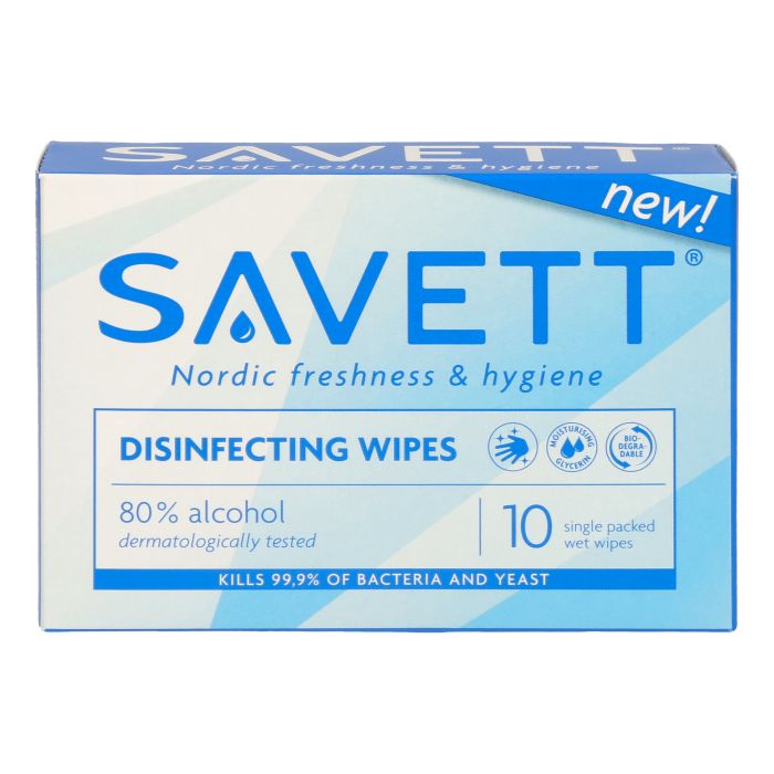 Savett Disinfecting Wipe on kosteuspyyhe ihon desinfiointiin ja/tai puhdistukseen. Yksittäispakatut pyyhkeet on helppo ottaa mukaan.