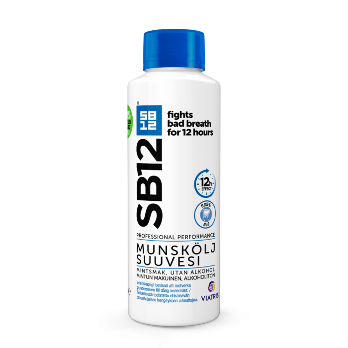 Käyttösuositus: Purskuta 10 ml suuvettä 30-60 sekunnin ajan aamulla tai illalla saadaksesi 12 tunnin ajaksi raikkaan hengityksen. 24 tunnin vaikutuksen saat käyttämällä suuvettä sekä aamulla että illalla. SB12-suuvettä suositellaan päivittäiseen käyttöön 12-vuotiaista alkaen.