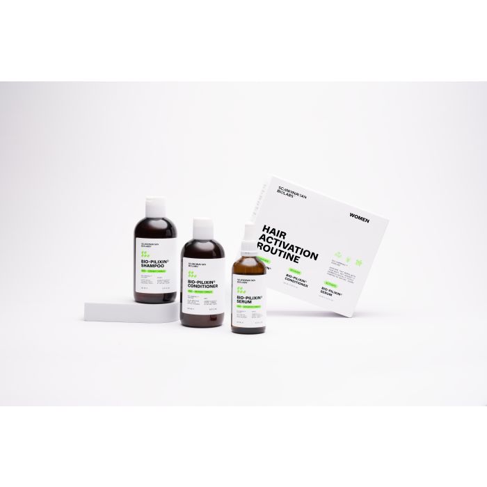 Ennenaikaista hiustenlähtöä ehkäisevä ja hiusten kasvua edistävä hiustenhoitosetti naisille. Scandinavian Biolabs Bio-Pilixin® Hair Routine For Women sisältää shampoon, hoitoaineen ja hiuspohjan seerumin, jotka edistävät hiusten kasvua ja vahvistavat hiuksia. Dermatologisesti testattu. Kehitetty ja valmistettu Tanskassa.