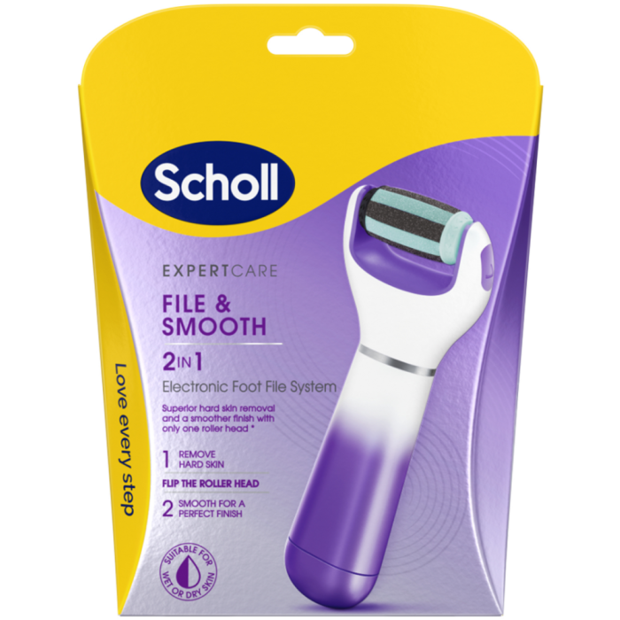 Schollin uudella paristokäyttöisellä jalkaraspilla saat sileät ja silkinpehmeät jalat vaivattomasti. Paristokäyttöisen raspin rulla sekä kuorii että silottaa ihoa. Kuorinnan jälkeen vaihtopää käännetään 180-astetta, joka silottaa ihon pinnan tasaiseksi.