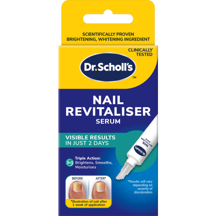 Dr. Scholl's Nail Revitaliser -seerumi tarjoaa näkyviä tuloksia vain kahdessa päivässä, auttaen parantamaan kynsien ulkonäköä. Erityisesti nopeita ja tehokkaita tuloksia varten kehitetty seerumi parantaa kynsien ulkonäköä, jopa aiemmin kynsisienen vaurioittamia kynsiä, palauttaen ne terveemmän näköiseen tilaan. Sen 3-in-1 kolmitehoinen koostumus kirkastaa, tasoittaa ja kosteuttaa kynsiä, jättäen ne raikkaiksi ja elvytetyiksi. Kliinisesti testattu ja tieteellisesti todistettu kirkastava ainesosa takaa luotettavat tulokset vaurioituneille kynsille. Sopii kaikille kynsityypeille, helppokäyttöinen levitys tekee kynsien hoidosta yksinkertaista ja tehokasta.