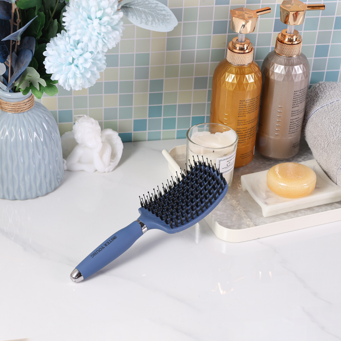 SisterYoung-sarjan hiusten selvitysharjat selvittävät kaikenlaiset hiukset tehokkaasti mutta hellästi. SisterYoung OVIA BLUE -selvitysharjassa on luonnonharjakset (wild boar) antistaattisilla nailonpäillä. Ergonomisesti muotoiltu. Harjan runko on ilmaa läpäisevä. Luistamaton varsi.