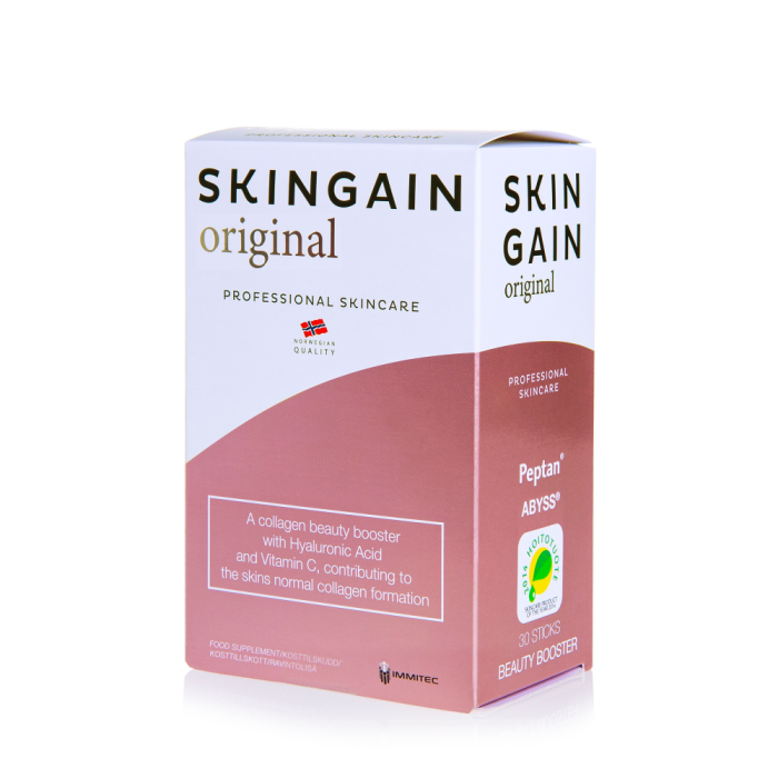 Skingain Original sisältää patentoidun yhdistelmän 1.- ja 2.-tyypin kollageenia. Nopeatehoinen kollageenijauhe auttaa ihoa ja hiuksia voimaan hyvin.