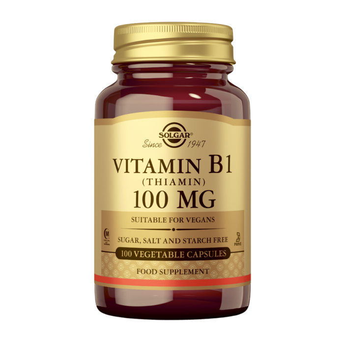 Solgar® B1-vitamiini 100 mg sisältää tiamiinina tunnettua B1-vitamiinia. B1-vitamiini on vesiliukoinen vitamiini, jota tulee saada ravinnosta. Se osallistuu ravinnon hiilihydraattien, proteiinien ja rasvojen muuttamiseen energiaksi. B1-vitamiinia löytyy luontaisesti täysjyvästä, pavuista, pähkinöistä ja lihasta. B1-vitamiini osallistuu kehon jokaisen solun toimintaan.